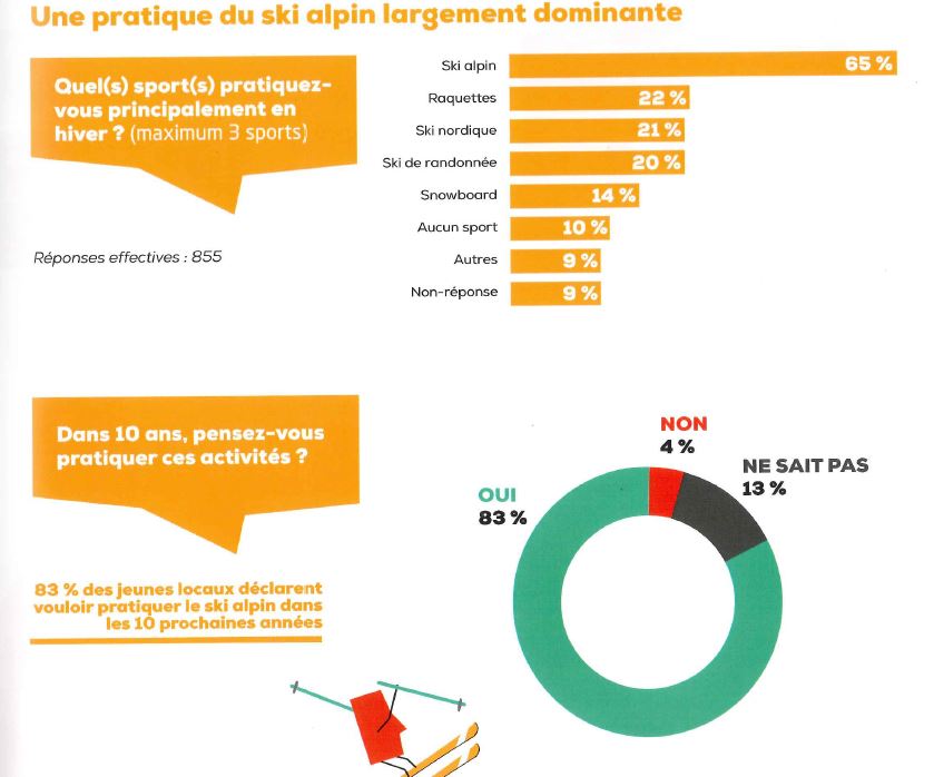 Interrogรฉs sur leurs pratiques de la montagne, les jeunes locaux l’associent majoritairement et spontanรฉment aux sports et beaucoup moins que leurs ainรฉs au terroir. Toutefois, 40% des rรฉpondants avouent ne pas (ou peu) pratiquer d’activitรฉ(s) sportive(s) en montagne.