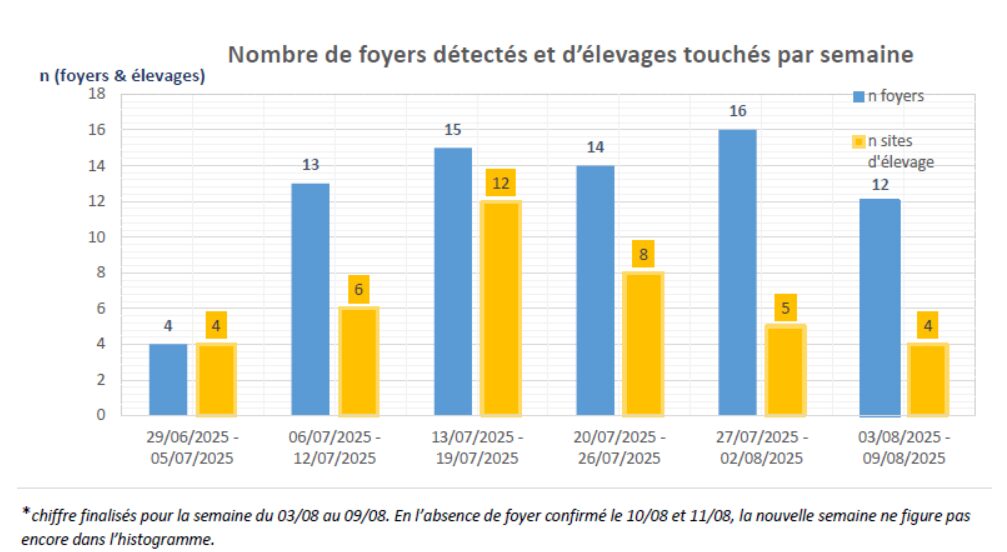 Six semaines après la détection du premier foyer de dermatose nodulaire contagieuse (DNC) en Savoie, « les vétérinaires annoncent un taux de vaccination dépassant les 70 % des bovins concernés dans la zone vaccinale », publie, ce 12 août, le ministère de l’Agriculture. Pour rappel, la campagne de vaccination a débuté le 18 juillet. Depuis sa mise en place, la ministre Annie Genevard déclare « observer, pour la première fois, une baisse sensible du nombre de foyers détectés (depuis le 22 juillet, la zone réglementée n’a pas évolué, signe de l’absence de propagation de la maladie) ». Et de rappeler : « Malgré ces résultats encourageants, il ne nous faut pas baisser la garde. Nous devons rester pleinement mobilisés » (voir le graphique ci-dessous).