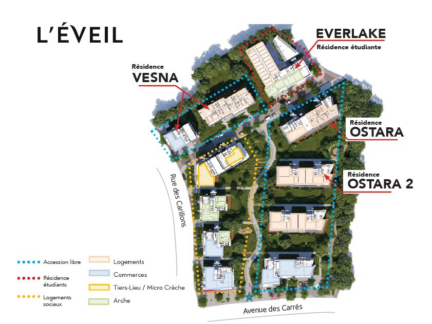 Cet ensemble immobilier, érigé sur l’ex-site de l’École catholique d’apprentissage (ECA), va s’étendre sur 28 680 m2. À terme, il comptera 11 bâtiments (R+5+attique) et intégrera 474 logements : 186 appartements en accession (résidences Vesna et Ostara), 85 logements sociaux réunis dans quatre bâtiments exploités par Halpades (dont un foyer pour personnes handicapées de 16 logements géré par Arche), une résidence étudiante Everlake de 204 logements, un tiers-lieu, une micro-crèche, ainsi que des commerces en rez-de-chaussée.