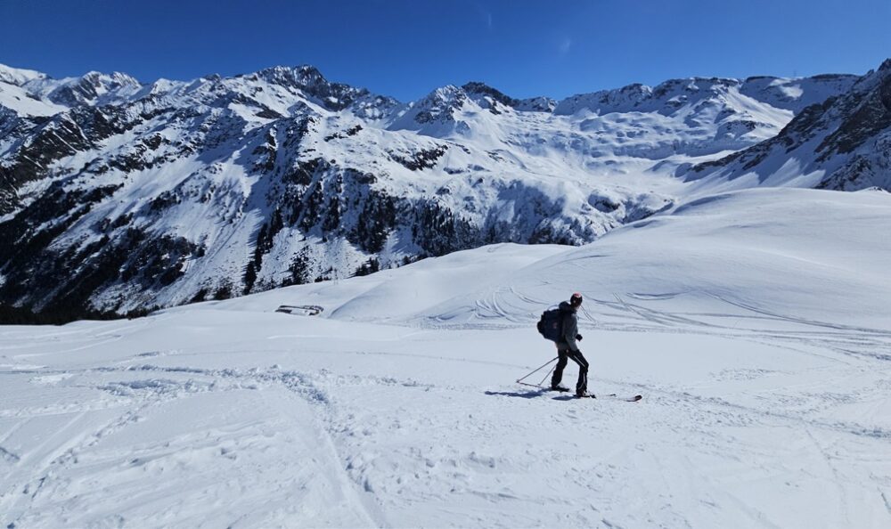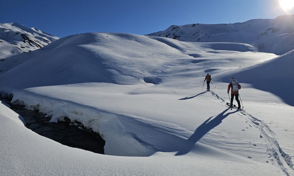 Le troisiรจme jour, c’est la journรฉe de ยซย grande grandeโ€ aventure ; un tour sauvage d’environ six heures en direction du col du Grand Fond (2 671 m) par la belle combe de la Neuva. La montรฉe commence doucement. Elle se muscle plus tard en transitant ponctuellement par le territoire de La Plagne Tarentaise, sous la Pointe du Presset et le lac รฉponyme, invisible sous la glace et la neige. Plusieurs passages requiรจrent les bons conseils des guides, celui d’Arpire notamment. Les pros ouvrent la voie et sรฉcurisent les zones de conversion. ร€ l’avant col de la brรจche de Parozan, un portage des skis est nรฉcessaire. La descente est superbe, fractionnรฉe, avec un premier passage au pied de la pointe de Presset (2 836 m) puis une courte descente dans une belle poudreuse. Nous franchissons alors le col du Grand Fond qui ouvre l’accรจs vers le refuge de Presset. Le puissant bรขtiment , implantรฉ en crรชte ร  2 509 m, apparaรฎt ร  l’horizon. Sa terrasse et ses chambres cathรฉdrales offrent un tour d’horizon ร  360 ยฐ juste รฉpoustouflant. Le refuge est habitรฉ, chauffรฉ, confortable et accueillant. Ses pop-corn au curry sont immanquables, accompagnรฉs d’une biรจre fraรฎche apprรฉciรฉe. Les grandes tables encouragent les rencontres et les jeux de cartes sans รฉcran, en apprenant parfois les rรจgles des randonneurs venus de toutes les rรฉgions du globe.