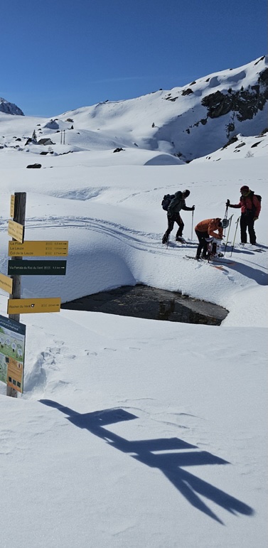 Ultime journรฉe de cette traversรฉe inรฉdite : la jonction vers Arรชches. La traversรฉe par le col du Bresson (2 469 m) tout proche marque l’entrรฉe en Beaufortain. La descente en face Ouest vers les Conchettes laisse le temps d’admirer la Pierra Menta (2 684 m) dont la silhouette caractรฉristique a donnรฉ son nom ร  une course en ski de randonnรฉe rรฉputรฉe. L’itinรฉraire est agrรฉable, mรชme si la qualitรฉ de la neige est plurielle, alternant entre petite croรปte fine et รฉpaisseur tendre. Il longe le โ€œlac des Chamoisโ€, encore gelรฉ et recouvert d’une รฉpaisse couche de neige, avant de grimper en rive droite du lac de Saint-Guรฉrin vers le col du Couvercle (2 296 m), ultime seuil avant de rallier par des pentes agrรฉables les Daves et le Darbelay, hauts hameaux d’Arรชches. La route d’รฉtรฉ est transformรฉe en piste qui dessert la station par le vallon aval du lac. C’est dรฉjร  fini ! Ou presque car il reste possible de revenir aux Contamines-Montjoie par le domaine de Hauteluce, via le col du Joly ; ou sinon d’envisager un taxi retour.