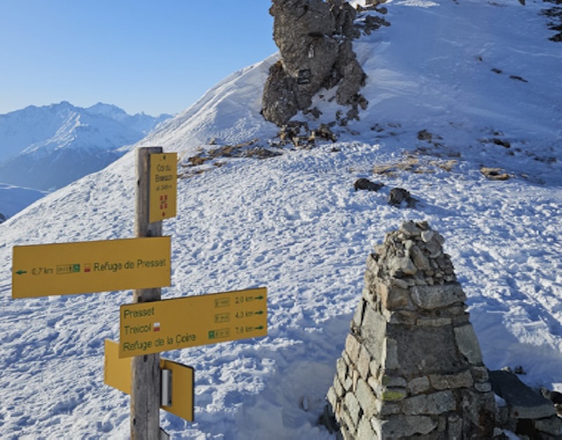 Rรฉveil dรจs 7 heures pour dรฉbuter ce pรฉriple inรฉdit dont les premiers mรจtres sont avalรฉs par les remontรฉes mรฉcaniques. Direction la tรฉlรฉcabine Montjoie au dรฉpart du hameau du Lay aux Contamines- Montjoie, puis le tรฉlรฉsiรจge de Bรปche Croisรฉe qui dessert le col du Joly. Lร , les traces horspistes abondent, il suffit de les suivre dans les pas des guides. Une aimable descente permet de se mettre en jambes. Hop, fixation des peaux et place ร  la premiรจre ascension vers le col de la Cicle (2 377 m). La montรฉe est un peu raide et attend que la conversion soit maรฎtrisรฉe : les deux pieds arrivent au mรชme niveau, un bรขton devant, un bรขton derriรจre, on lรจve le pied amont avec un petit coup de talon pour remettre le ski ร  l’horizontal. Rotation, appui et le ski aval suit le mรชme rituel. La marche peut reprendre. Une fois franchi le col, la descente, la premiรจre de ce beau voyage, est aisรฉe dans un paysage vallonnรฉ aux reflets nacrรฉs, en direction du confortable refuge des Prรฉs. La bรขtisse a รฉtรฉ rรฉnovรฉe. Elle offre des chambrรฉes confortables et mรชme la possibilitรฉ d’apprรฉcier une douche avec modรฉration, car l’eau et la chaleur sont comptรฉes. Les installations sont en autonomie. Cet itinรฉraire introductif est assez court : quatre heures environ d’oรน l’ajout d’une escapade complรฉmentaire l’aprรจs-midi vers le col de la Fenรชtre.