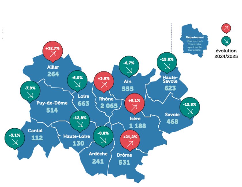 Le nombre de chefs d’entreprise ayant perdu leur emploi en 2025 s’élève à 7 354 en Auvergne-Rhône-Alpes (contre 61 459 en France) et semble enfin se stabiliser, par rapport à l’année précédente (-0,1 %), «  même si, pour la deuxième année consécutive, plus de 7 000 dirigeants sont concernés  », dévoile l’observatoire de l’emploi des entrepreneurs réalisé par l’association GSC et Altares et publié le 17 mars. Il fait suite à trois années de hausse continue : +15,7 % en 2024, +38,7 % en 2023 et +39,6 % en 2022.