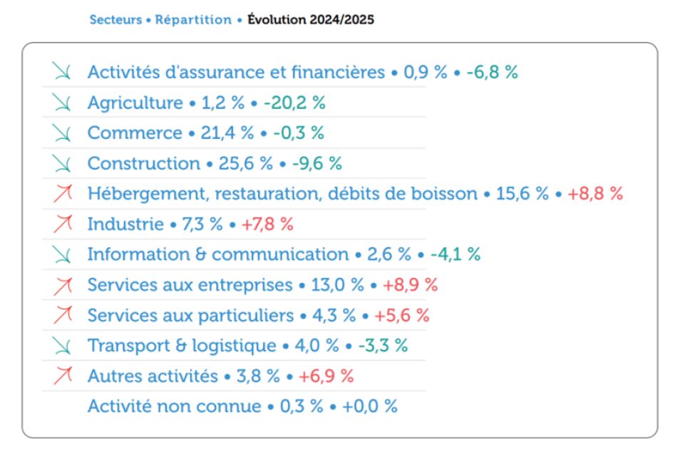 Les services aux entreprises et le secteur de l’industrie restent aussi sous pression, avec respectivement +8,9 % (955 dirigeants) et +7,8 % (537). À l’inverse, les activités d’assurance et financières résistent plutôt bien (-6,8 %).