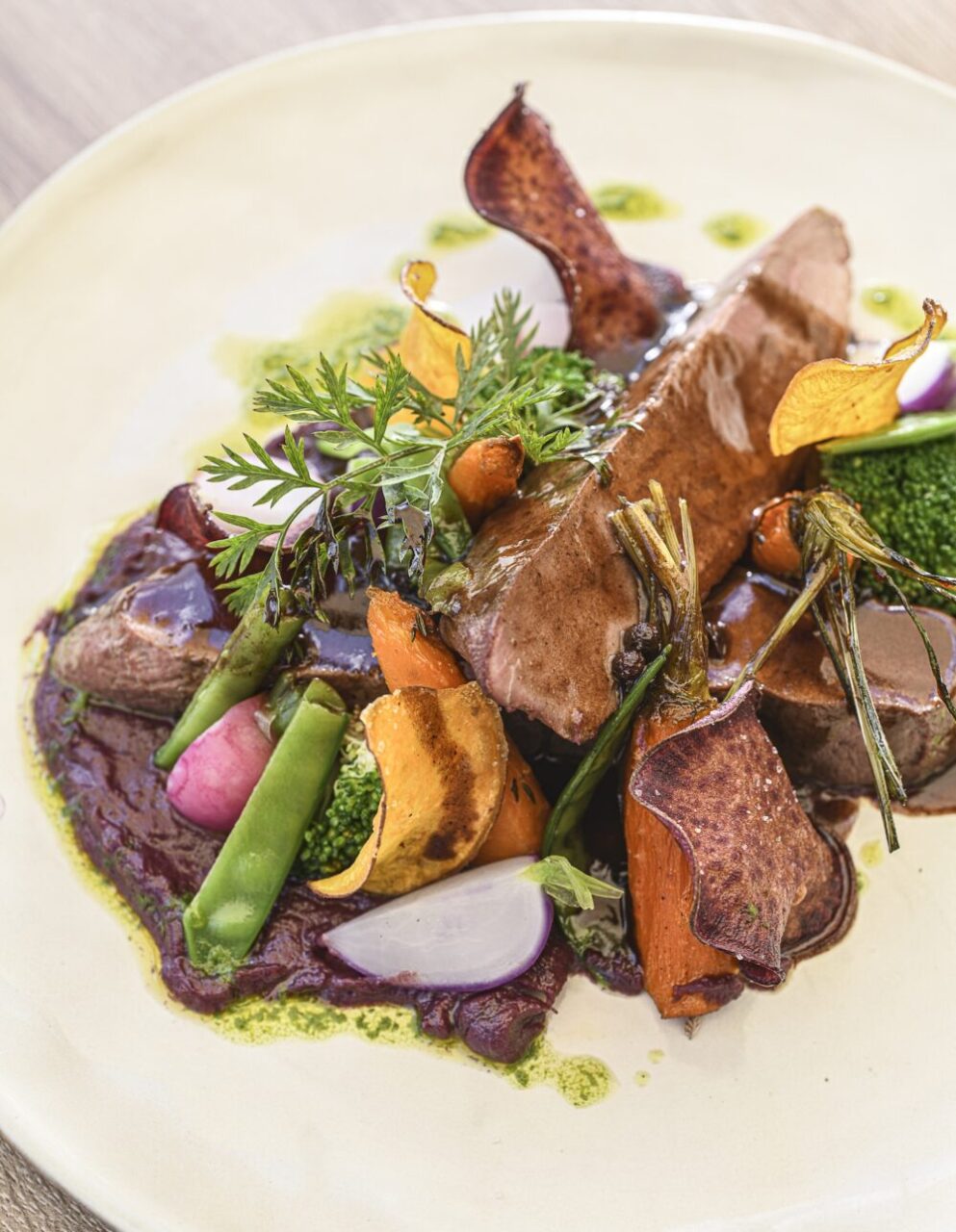 La cuisine, française dans son âme et voyageuse dans ses accents, est menée par Jordan Gallin-Martel. Il y revisite les classiques avec tact, joue des textures, suit les saisons et travaille des produits frais, locaux et bien sourcés. Le midi, place à l’efficacité gourmande avec un menu du jour à 25 € ou un plat du jour à 17 €. Le soir, la carte s’étire, invite au partage, et ouvre la porte aux découvertes — celles qui surprennent sans jamais désorienter.