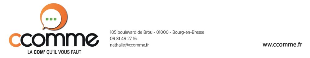 Basรฉe ร Bourg-en-Bresse, lโagence Ccomme, cโest une รฉquipe de trois personnes, 15 ans dโexistence et plus de 35 ans dโexpรฉrience professionnelle dans la communication. Envie de faire renaรฎtre votre image deโmarque et dโaller plus loin dans votre communication globale ? Nous venons ร votre rencontre dans toute la rรฉgion Auvergne-Rhรดne-Alpes. Dans votre mรฉtier comme dans le nรดtre, lโhumain est au coeur de tout, et la confiance se construit toujours mieux les yeux dans les yeux.
